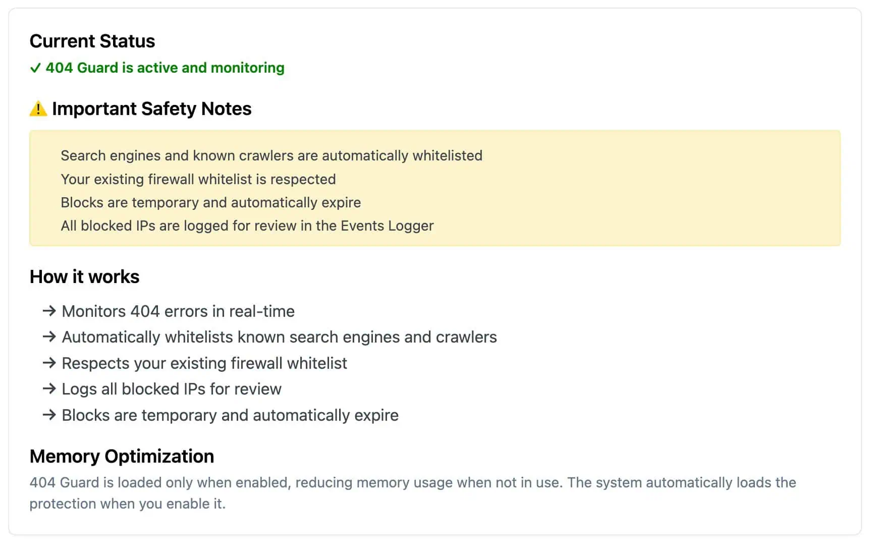 404 Guard automatically spots and blocks IPs that generate too many 404s - safely, smartly, and without touching real human visitors or search engines.