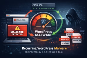 If your site looks clean and then gets “infected again,” focus on what’s rewriting files. This story shows how a cron job was re-injecting malware daily.